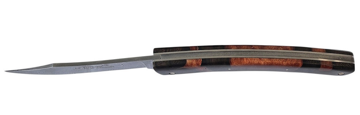 La véritable signature de ce couteau réside dans la confection de son manche. Nous avons utilisé du Ziricote, une essence de bois précieuse d'Amérique centrale, travaillée ici en bois debout.