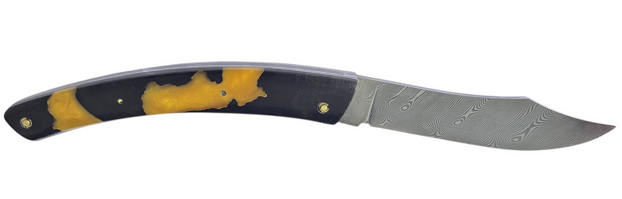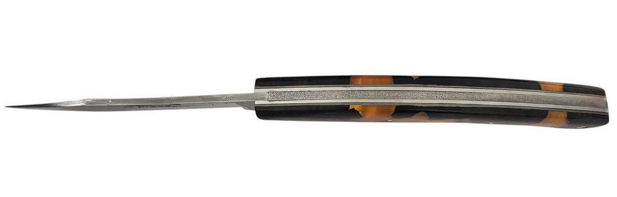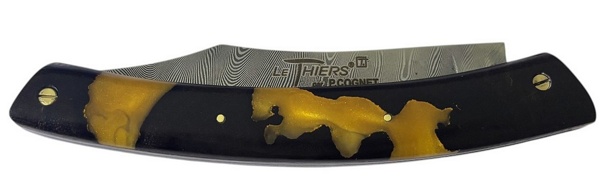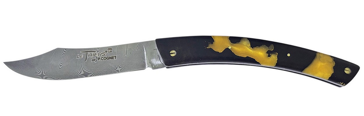 Couteau de poche Le Thiers® par P. Cognet avec un manche en ziricote et résine or nacrée et une lame damas en acier au carbone « Twist ».