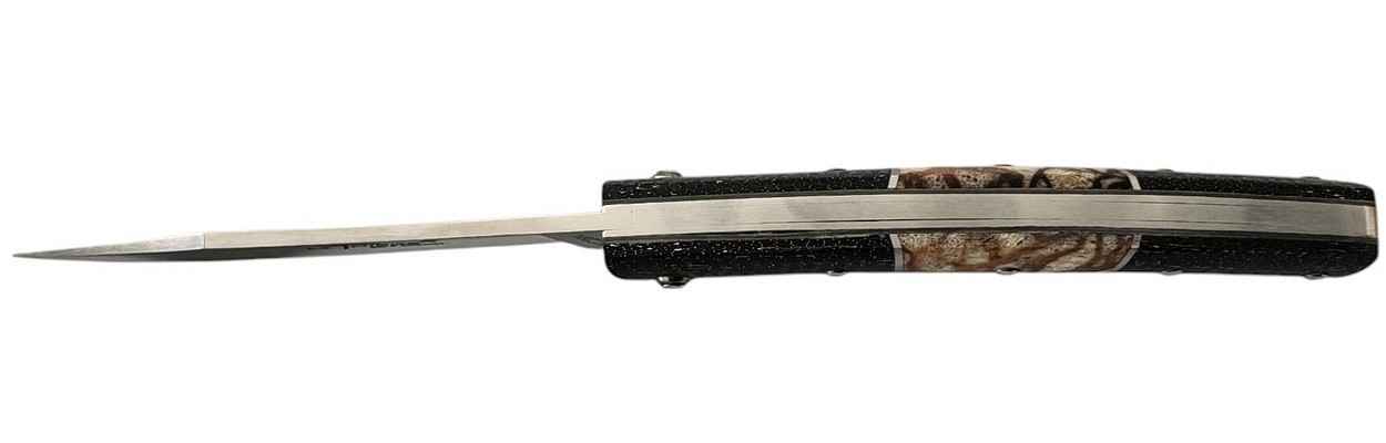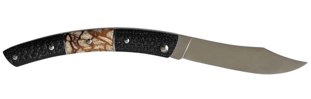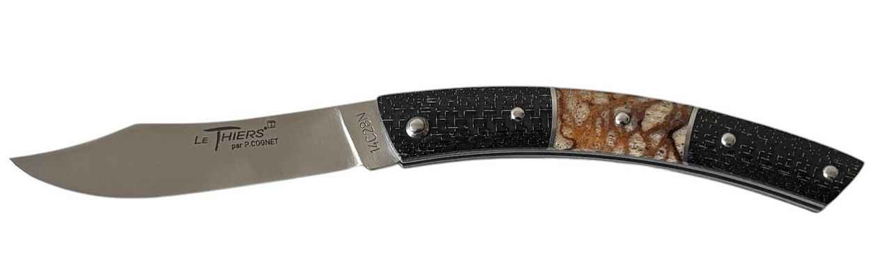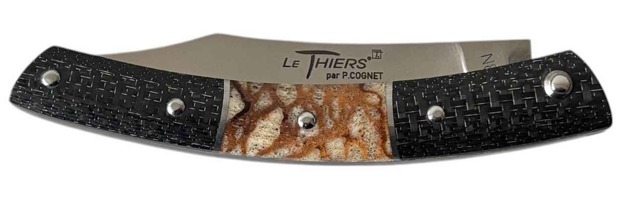 Couteau fermant Le Thiers® par P. Cognet, un manche en fibre de carbone tressée avec un fil argenté.