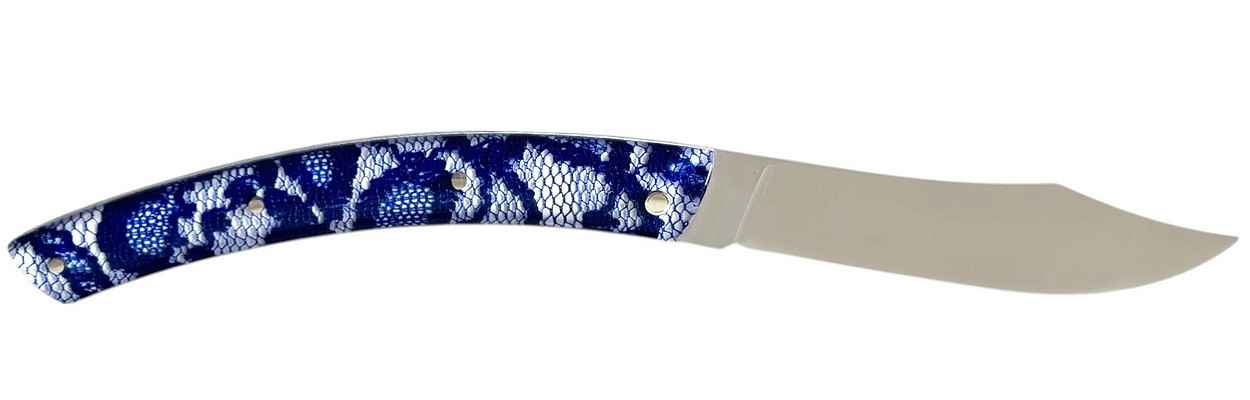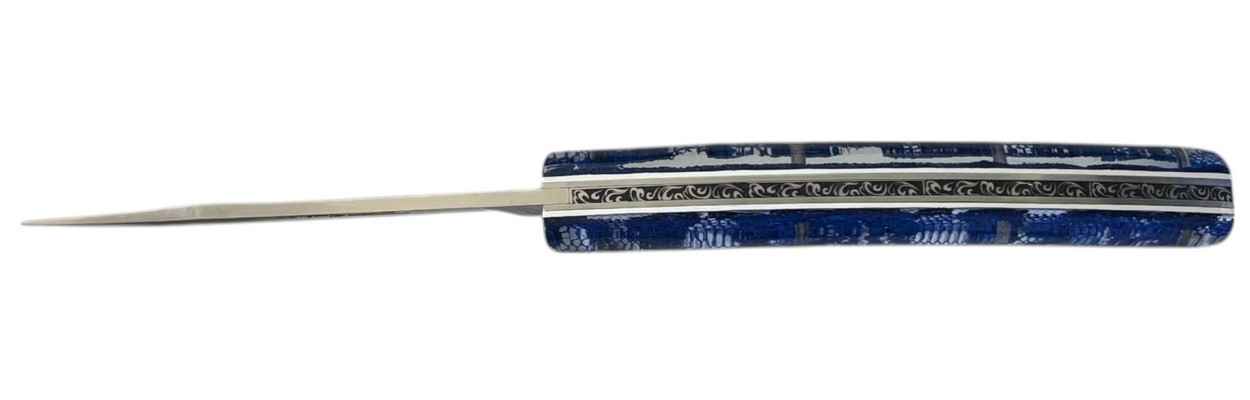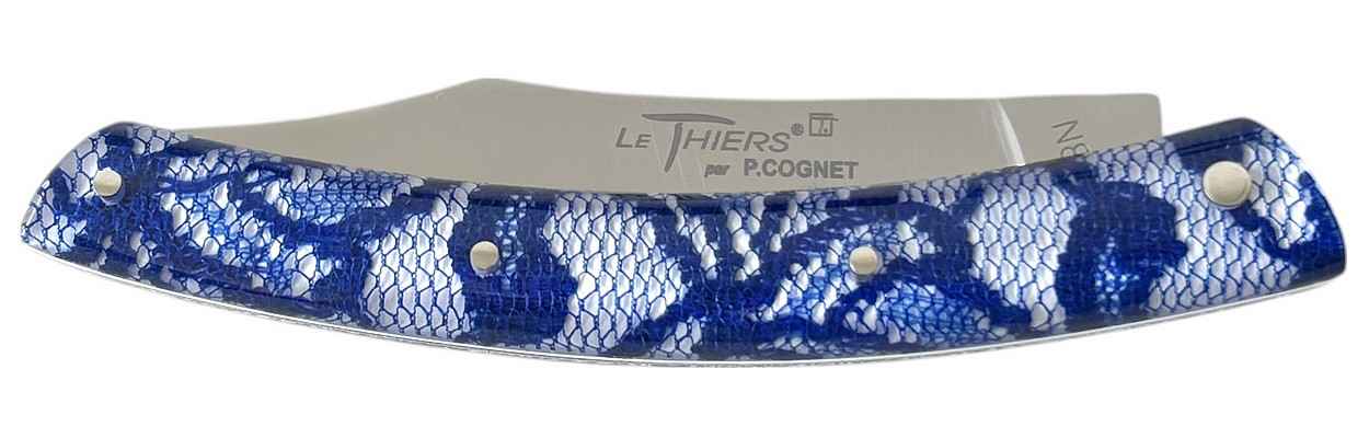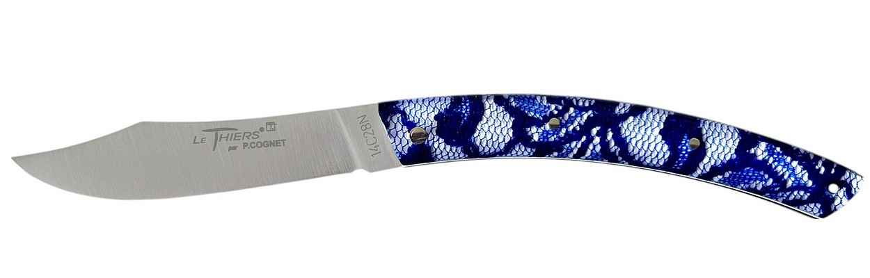 Couteau fermant Le Thiers® par P. Cognet avec un manche résine inclusions dentelle bleue.