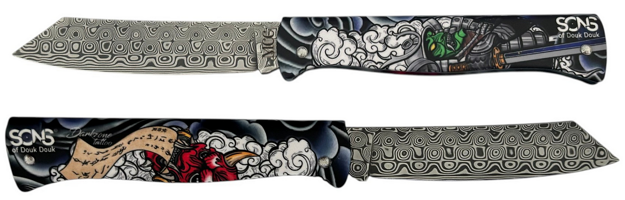 Couteau de poche Sons of Douk-Douk® Thème Art Japonais Oni, lame Higonokami acier damas inoxydable, motif "Roses".