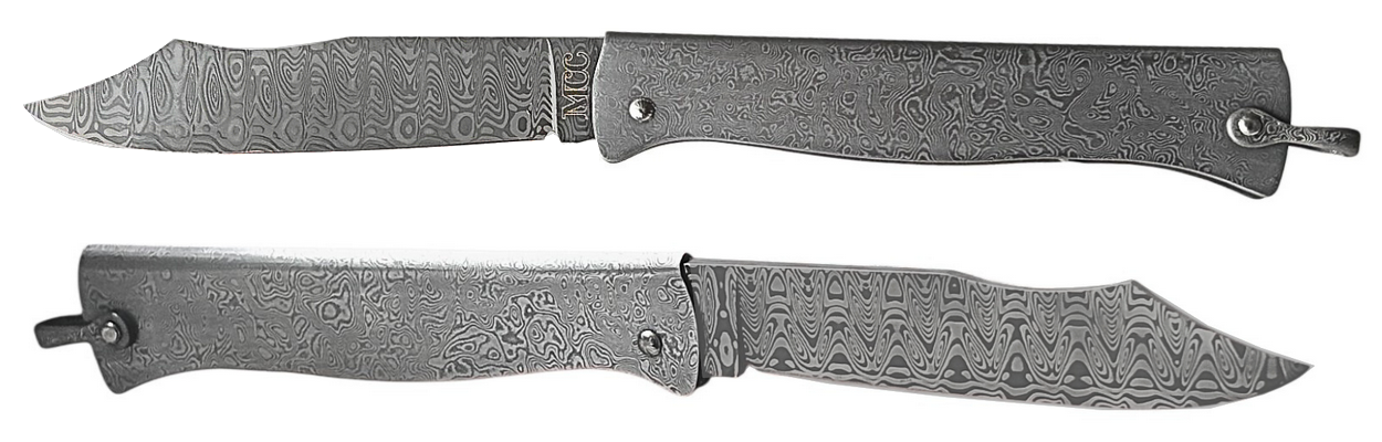 Couteau de poche Douk-Douk® chromé en tout damas, avec un manche et sa bélière en acier damas Wild et une lame Douk-Douk en damas Ladder.