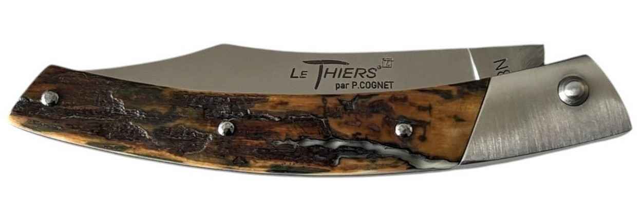 Sur le manche du couteau Le Thiers par P. Cognet, nous retrouvons un intercalaire noir des clous moletés et une mitre en maillechort, ce qui rend le couteau unique.