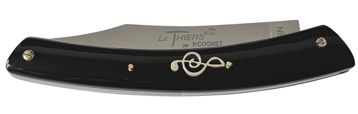 Couteau fermant Le Thiers® par P. Cognet avec un manche en résine noire à inclusions charm sur les deux côtés du manche.