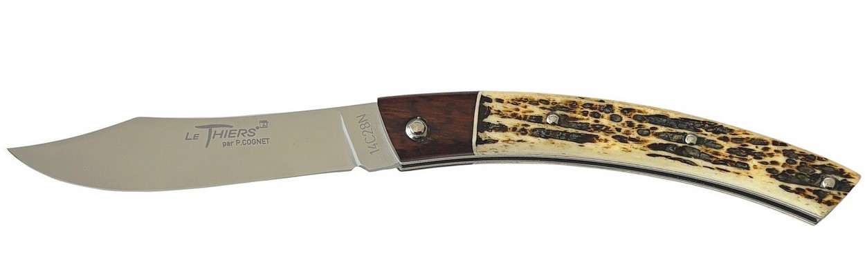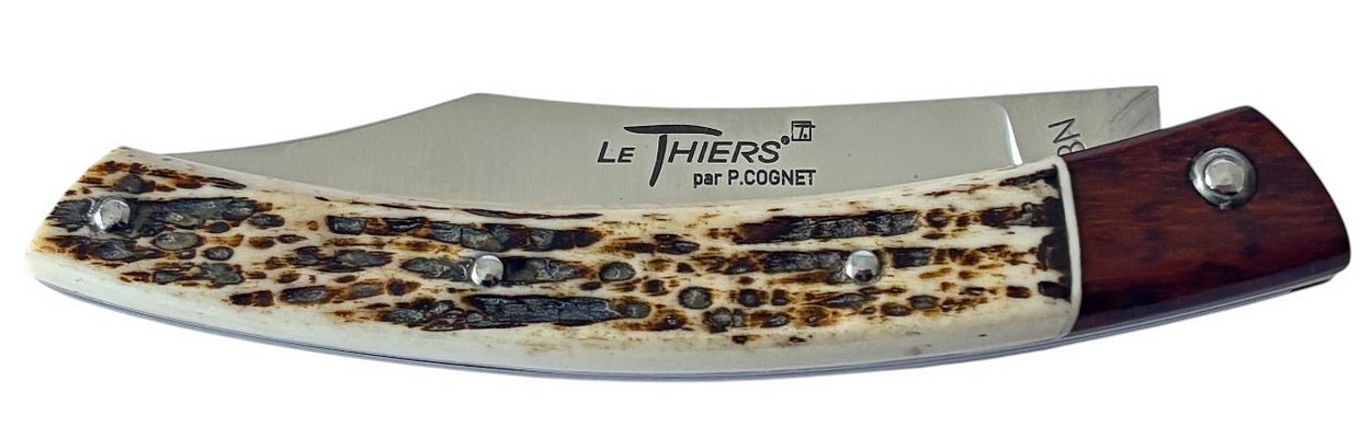 Couteau fermant le Thiers® par P. Cognet avec un manche en os cerfé et une mitre en bois d’amourette.