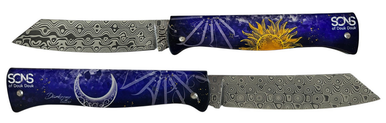 Couteau de poche Sons of Douk-Douk® au thème Mauresque avec une lame Higonokami en damas Roses.